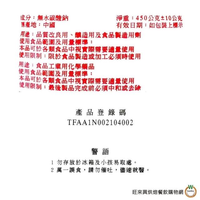 旺來興烘焙餐飲購物網食品級鹼粉 450g (無水碳酸鈉) / 包