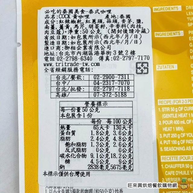 旺來興烘焙餐飲購物網COCK 泰式咖哩 系列 黃咖哩 紅咖哩 綠咖哩 50g /包 南洋咖哩 五辛素