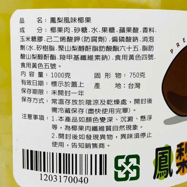 旺來興烘焙餐飲購物網旺來興 鳳梨風味椰果 1kg/罐 (含罐總重:1150g) 椰果 泡沫茶飲 剉冰 飲料配料 家庭有效日期2026.9.1