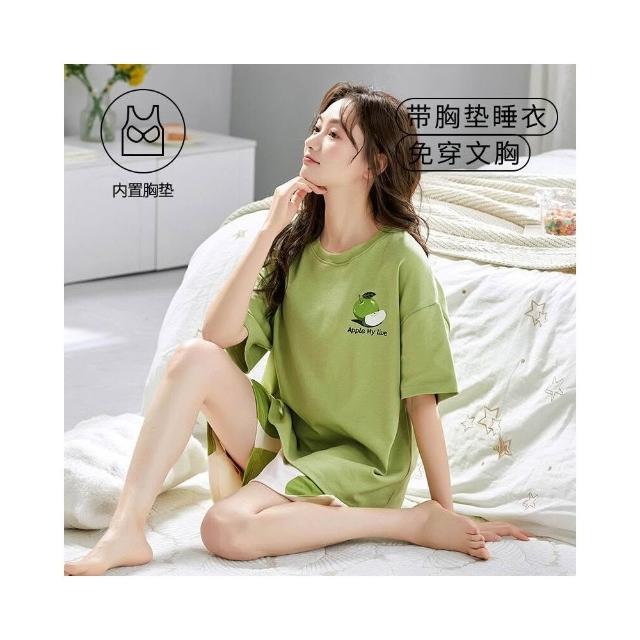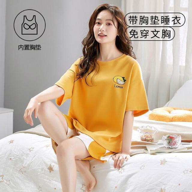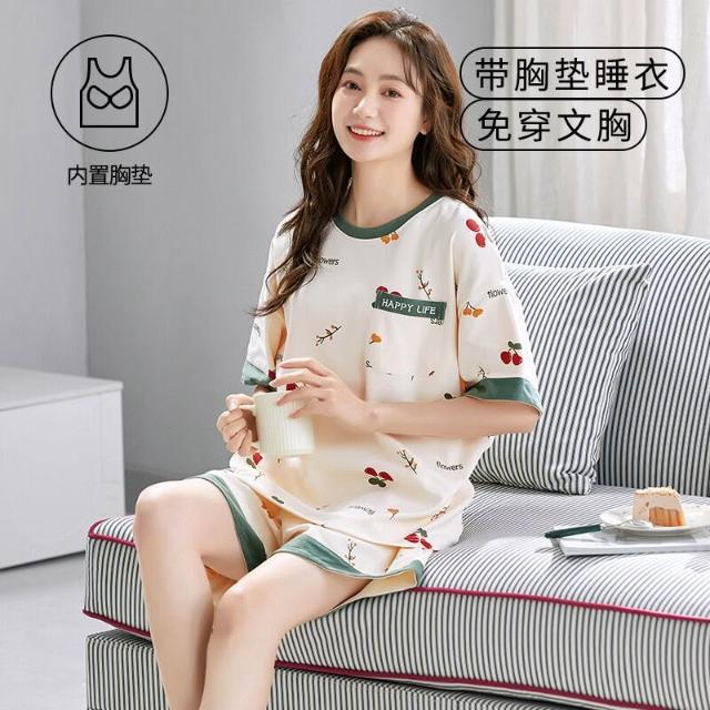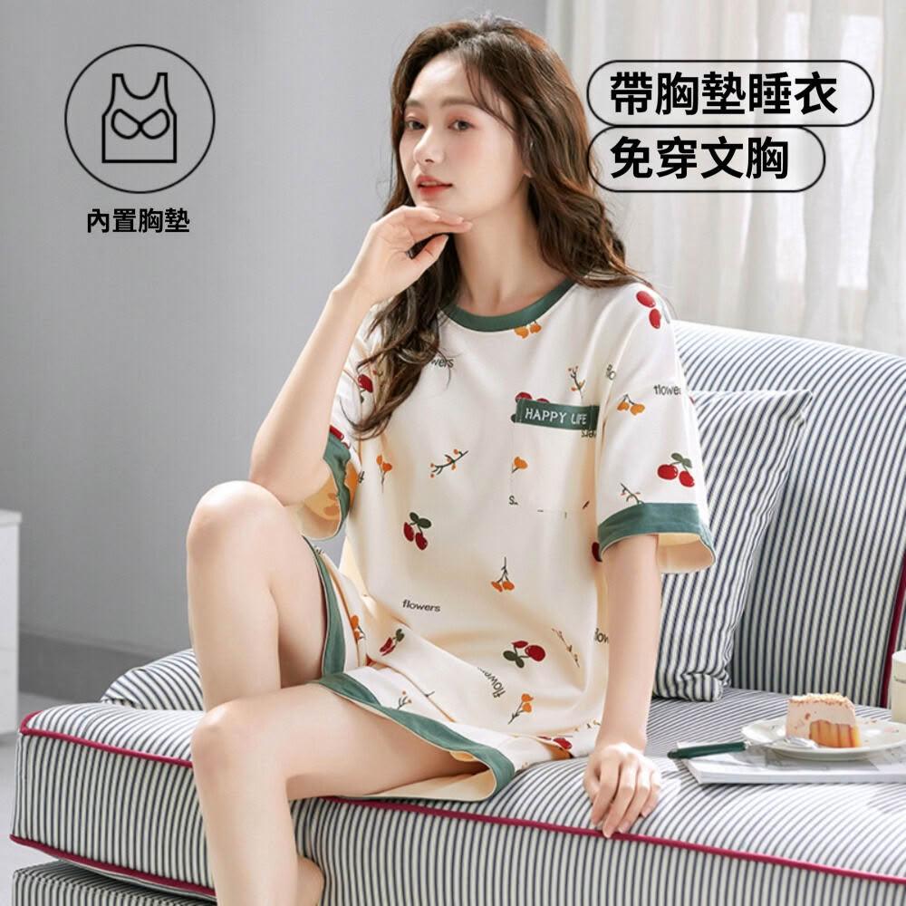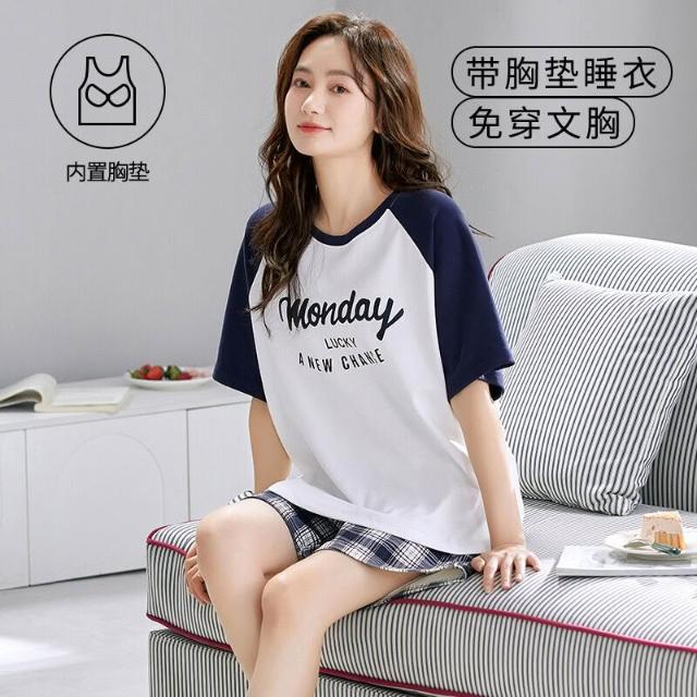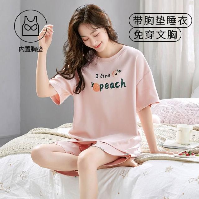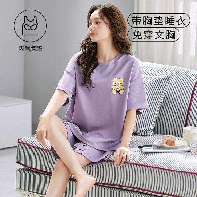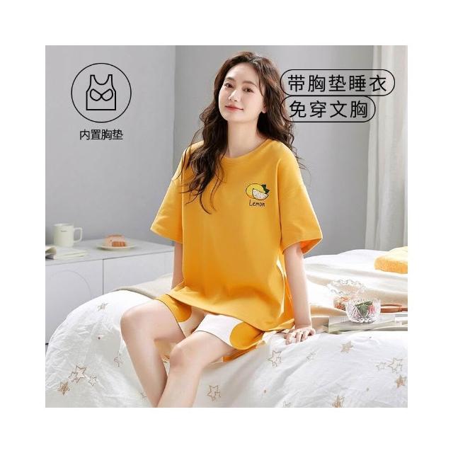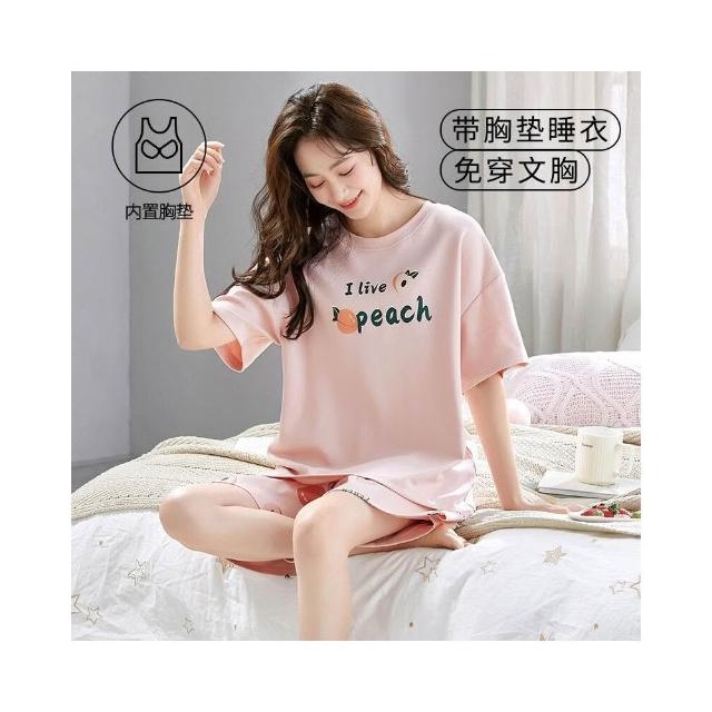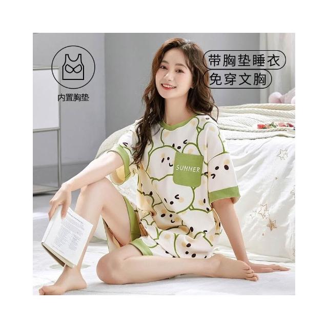 短袖睡衣套裝女2025新款大尺碼帶胸墊防凸點居家服女生薄款純棉睡衣可外穿女童卡通可愛家居服女款學生休閒居家睡衣