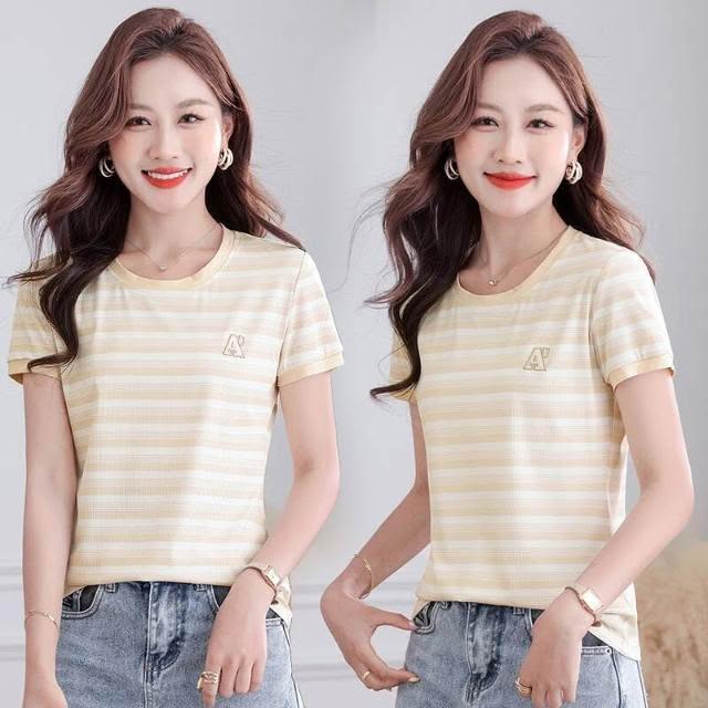 冰絲T恤女薄款涼感速乾寬鬆落肩通勤簡約簡約素面柔軟抗皺不變形親膚透氣時尚條紋撞色T恤時尚流行夏季圓領短袖T恤顯瘦大碼打底衫