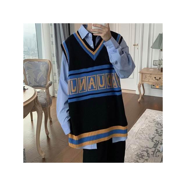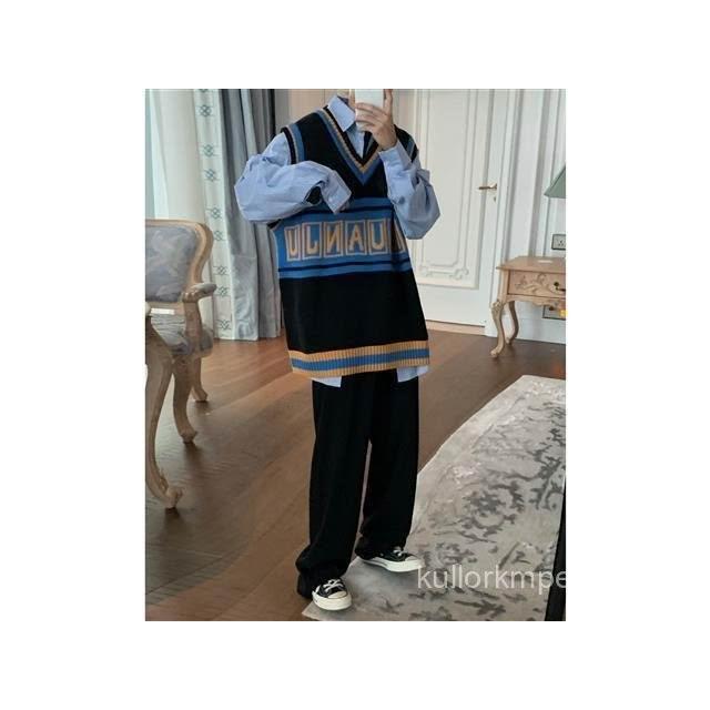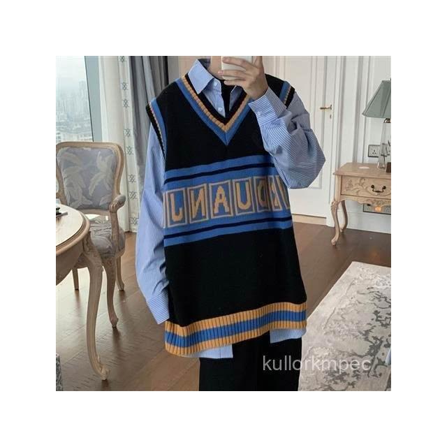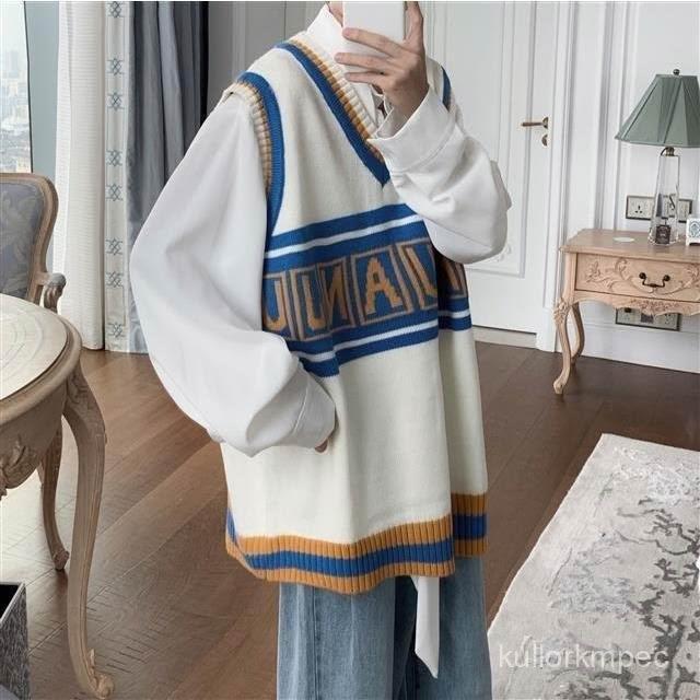 ins秋季潮流針織衫V領無袖毛衣男韓版學生寬鬆學院風背心馬甲男女