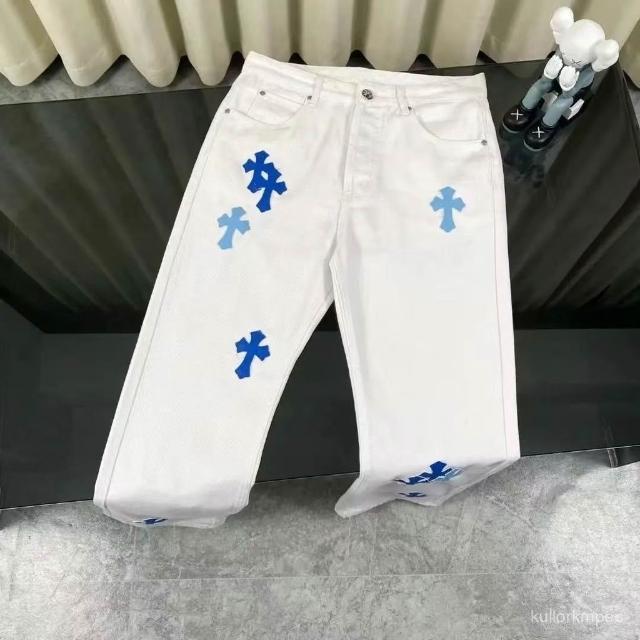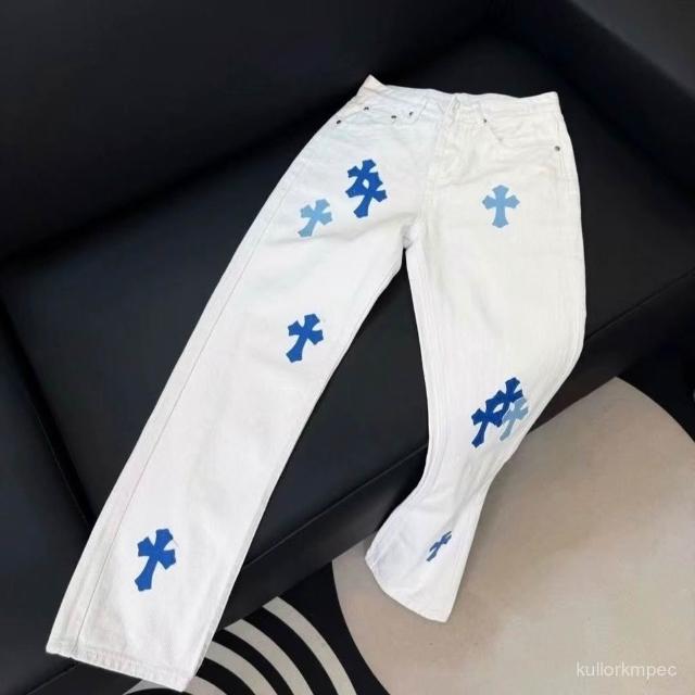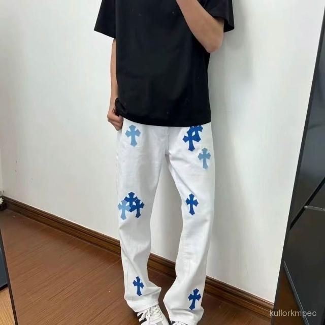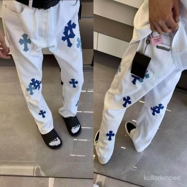 高街美式複古刺繡貼皮十字架白色牛仔褲男女水洗寬鬆休閒直筒長褲