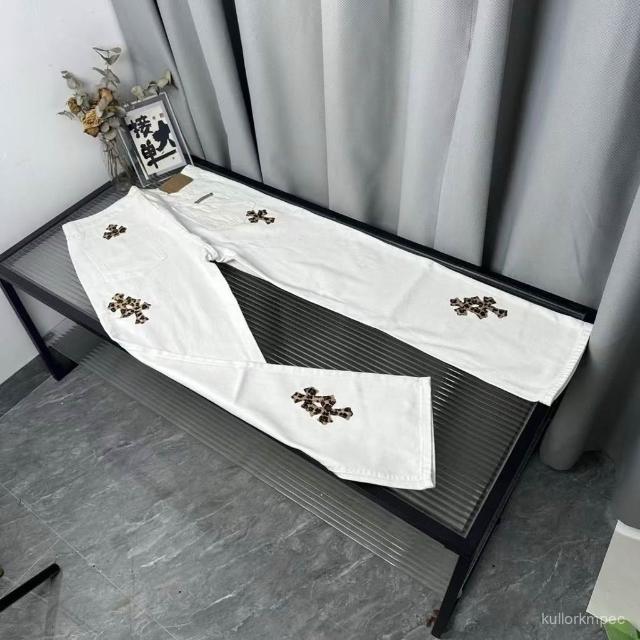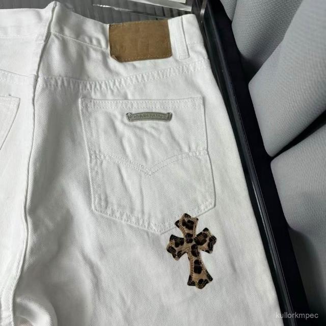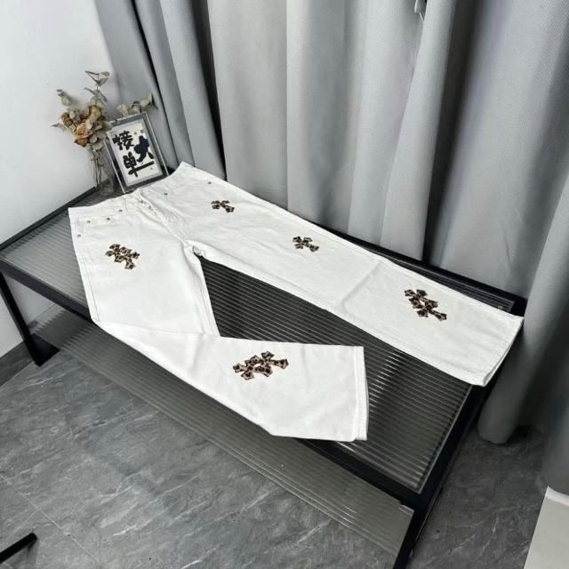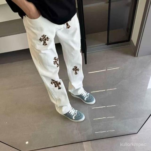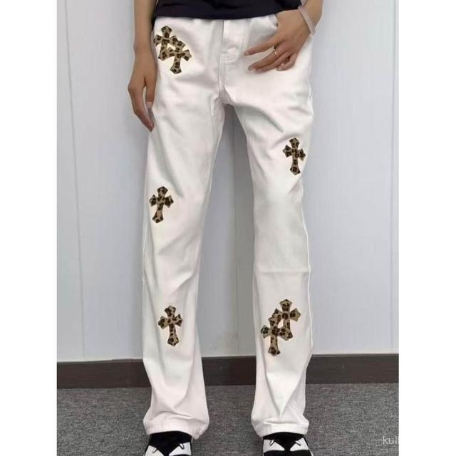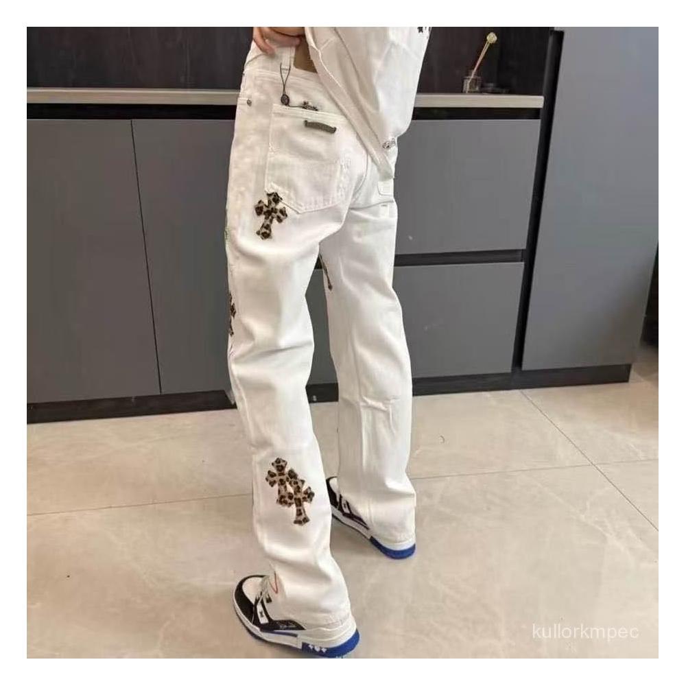 美式高街2025新款刺繡貼皮十字架白色牛仔褲男女寬鬆休閒直筒長褲