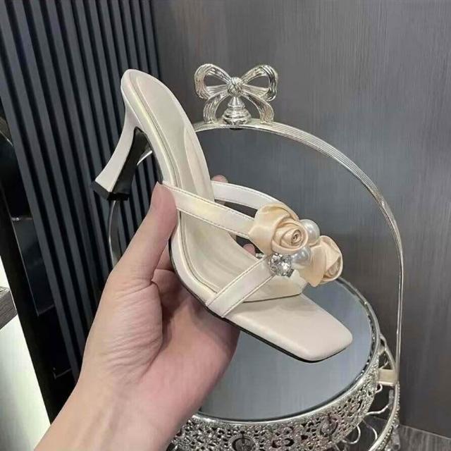 彬彬甄選2026珍珠夏季水鑽新款高跟鞋花朵氣質露趾時尚一字涼拖鞋