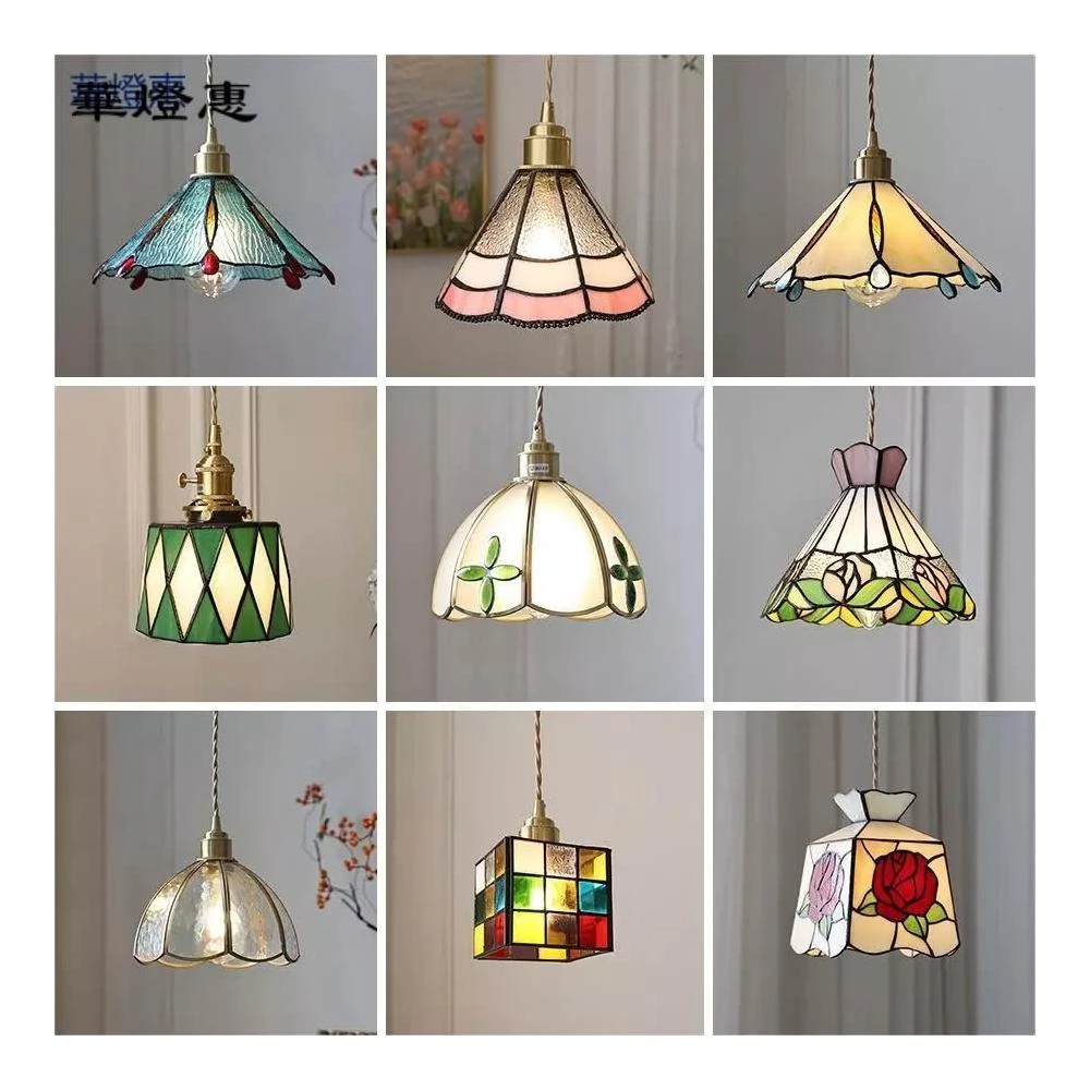 華燈惠 吊燈 復古 黃銅玻璃 北歐 餐廳 吊燈燈座 LED 錫燈美式風格床頭過道餐廳咖啡廳彩色玻璃小吊燈