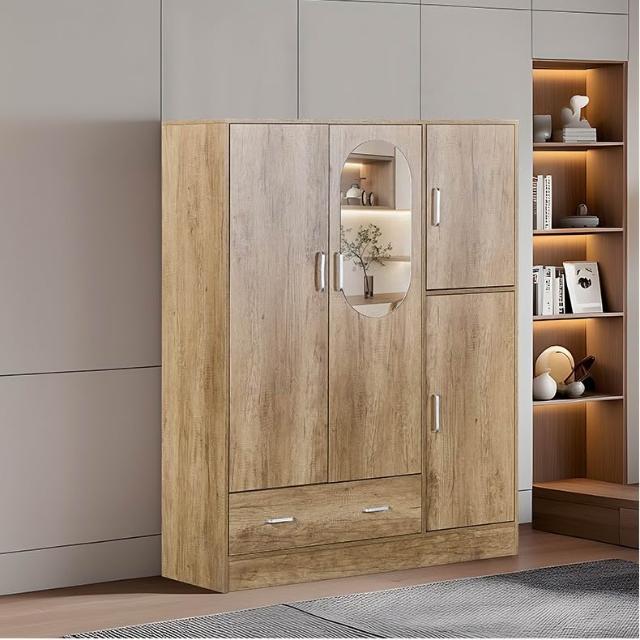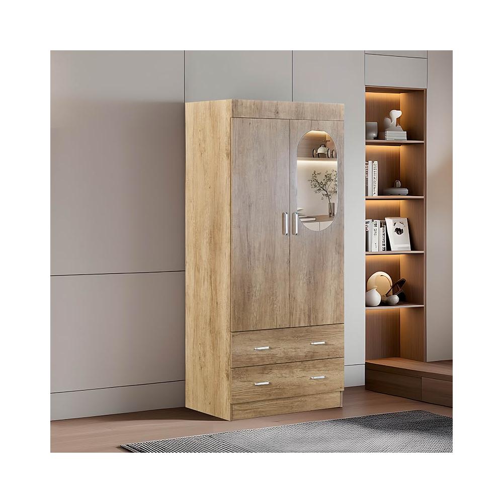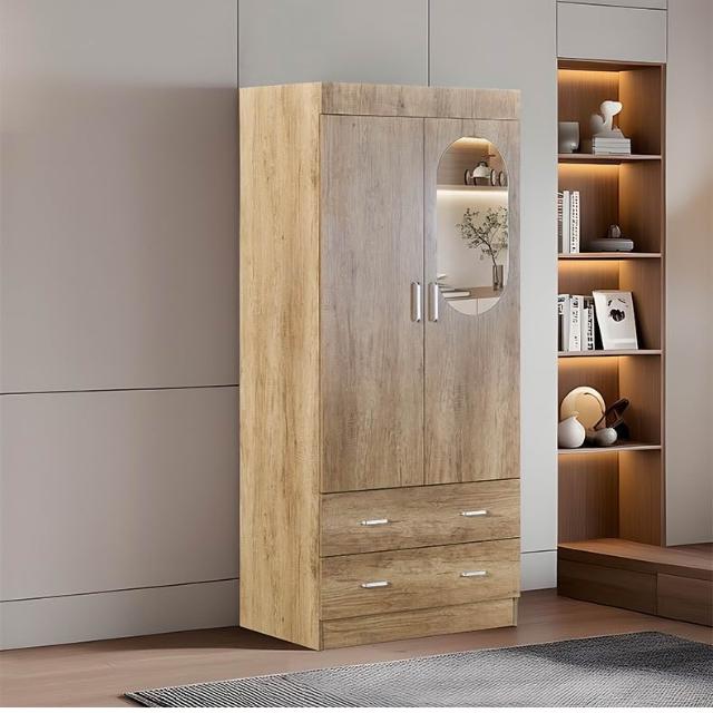 定制衣櫃家用臥室帶抽屜木色衣櫃簡約款帶鏡子雙開門儲物衣櫥批發