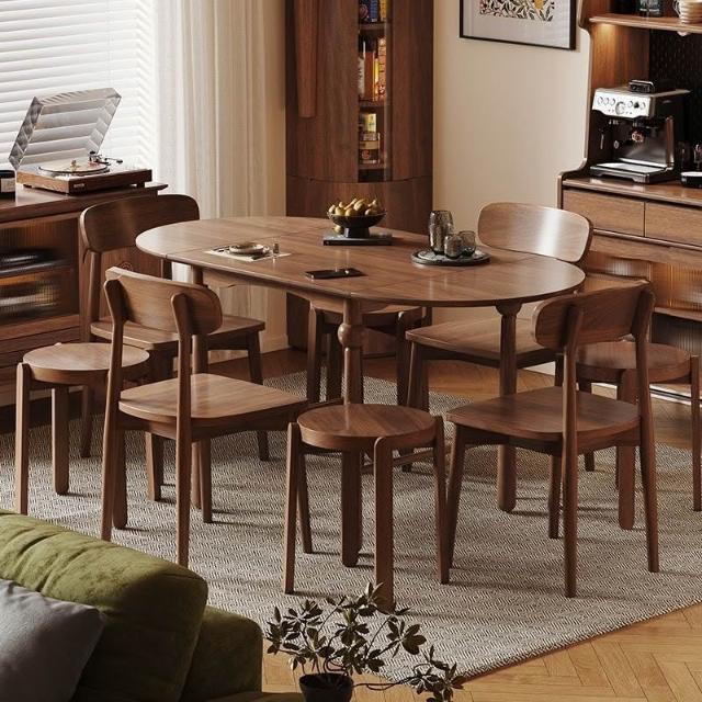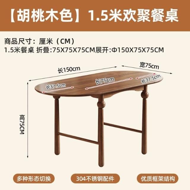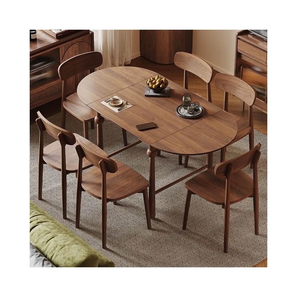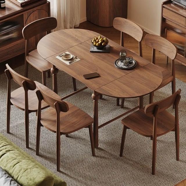 法式復古全實木胡桃色伸縮折疊餐桌橢圓桌家用小戶型餐桌椅組合