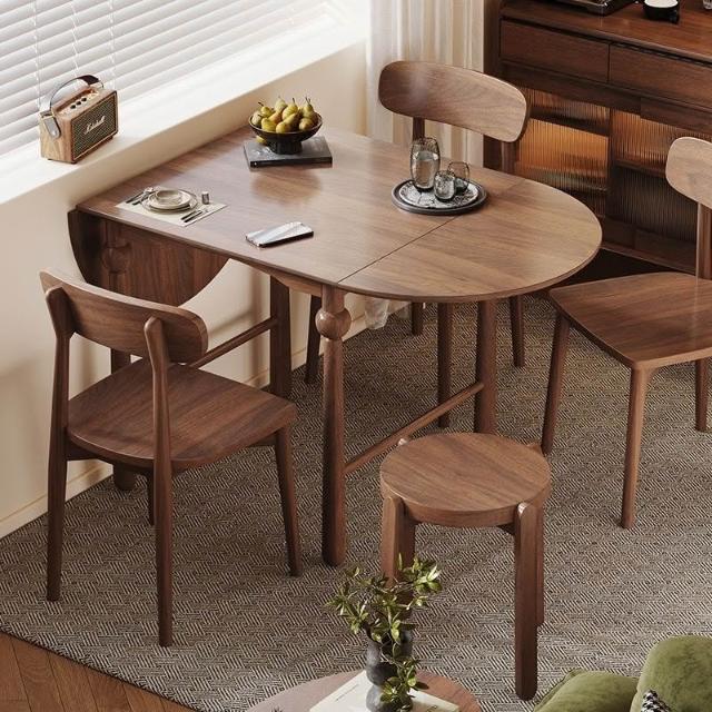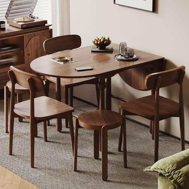 法式復古全實木胡桃色伸縮折疊餐桌橢圓桌家用小戶型餐桌椅組合