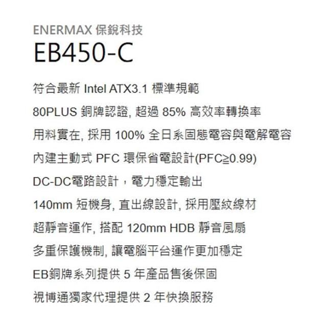 ENERMAX450W EB450-C 80PLUS銅牌 直出線 ATX3.1 電源供應器
