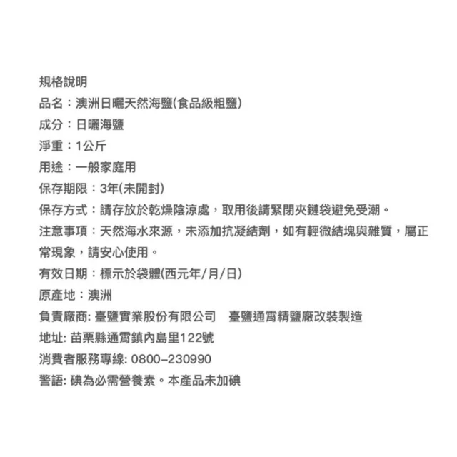 台鹽生技澳洲日曬天然海鹽(粗鹽)(1Kg/包)*12包組