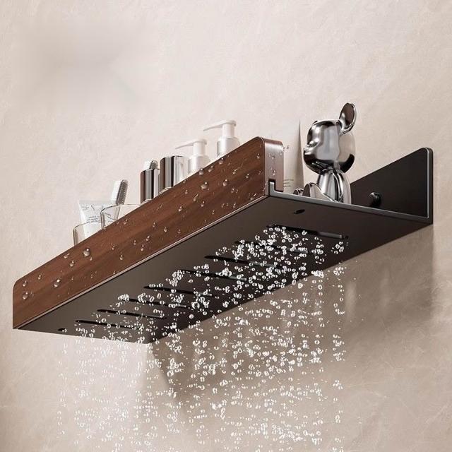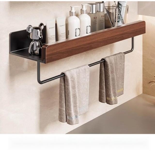 掛壁置物架 浴室免打孔衚桃木置物架 壁掛式洗漱用品收納架 多功能毛巾浴巾收納架