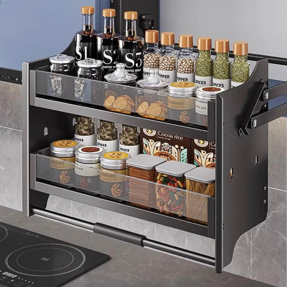 新款廚房收納架 廚房吊櫃升降拉籃 櫥柜上下緩衝高櫃開門式調味籃 太空鋁下拉式廚櫃調料架收納架 櫥櫃鑲入式置物架