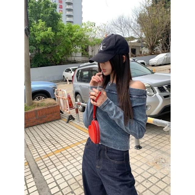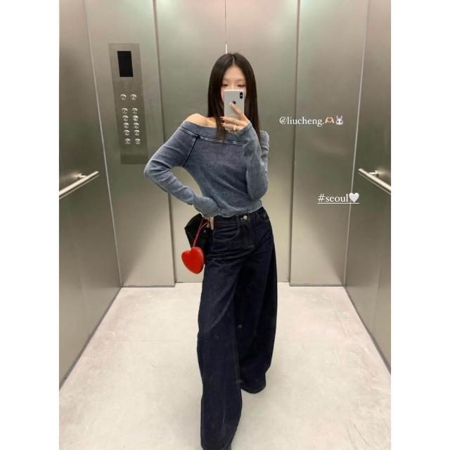 2024~頂級時髦/美式復古一字領水洗做舊短版長袖T恤 辣妹上衣 女生秋季百搭tee