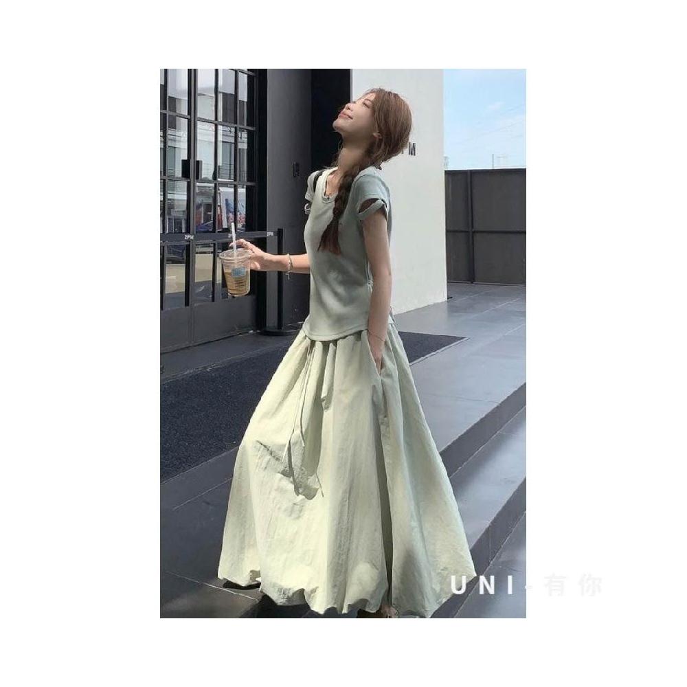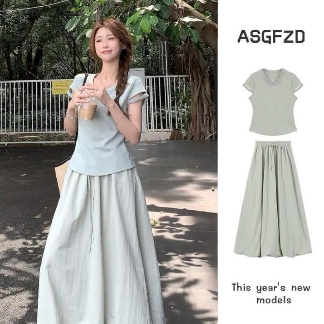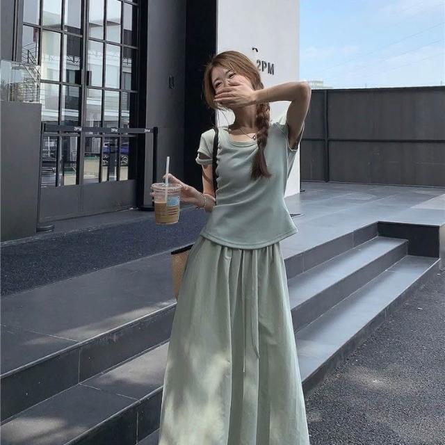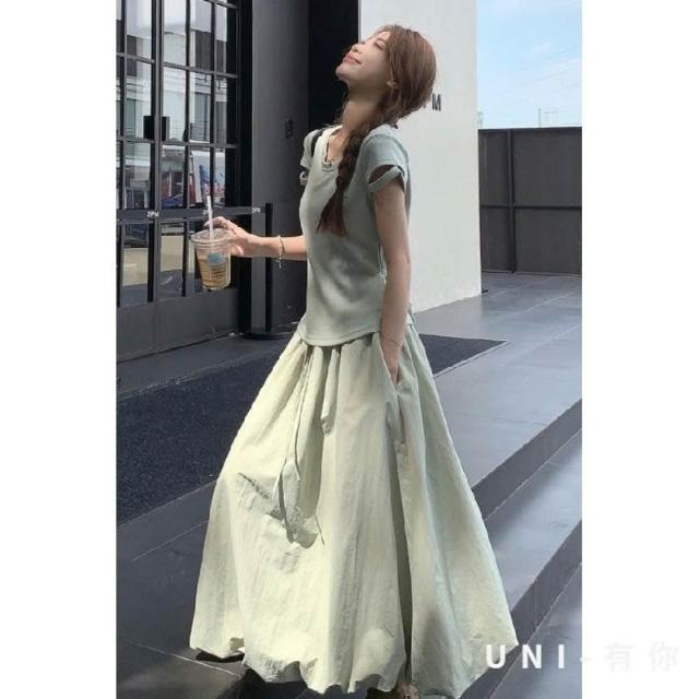 氣質綠色顯瘦a字花苞長裙2025新款連衣裙子套裝女夏季穿搭一整套