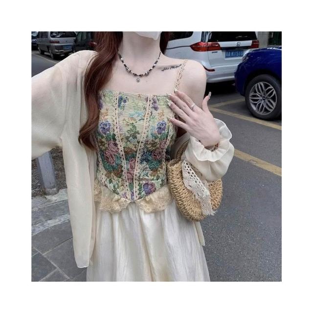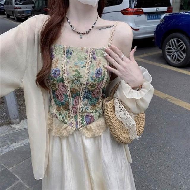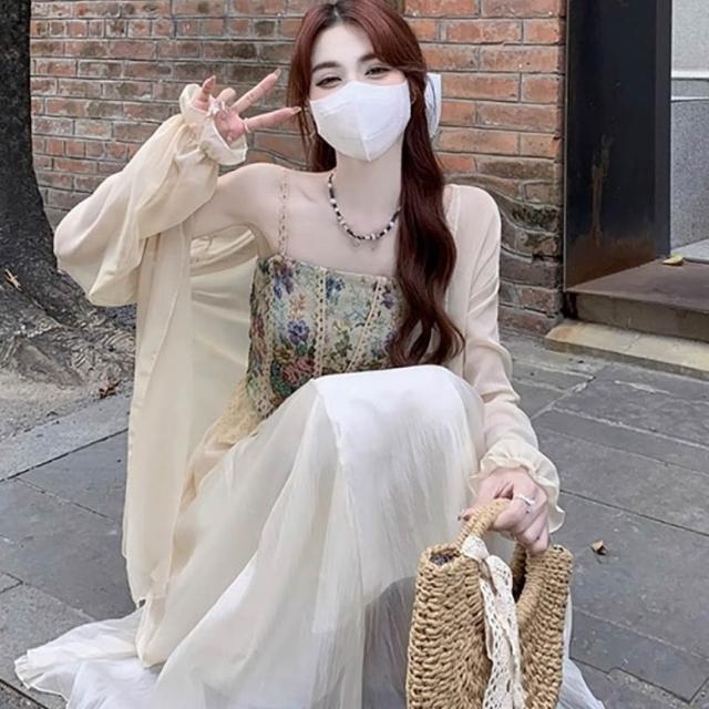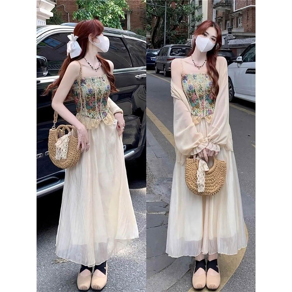 法式復古油畫碎花吊帶背心防曬衫半身長裙女2025新款網紗裙套裝女