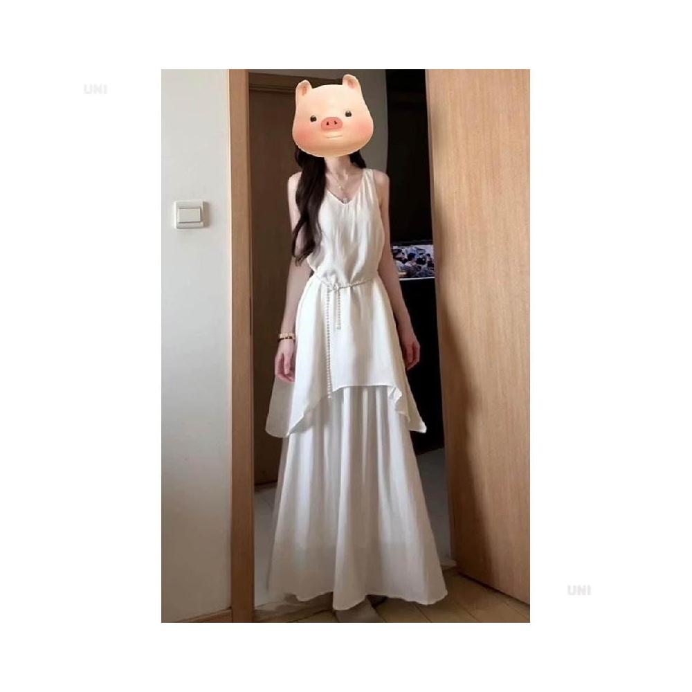 白色度假風v領 背心 連衣裙子套裝女夏日絕美初戀無袖長裙旅遊穿搭