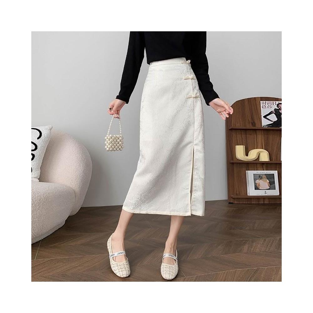 復古國風提花盤扣半身裙女春季新中式高腰開叉a字直筒包臀中長裙