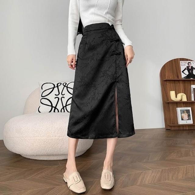 復古國風提花盤扣半身裙女春季新中式高腰開叉a字直筒包臀中長裙