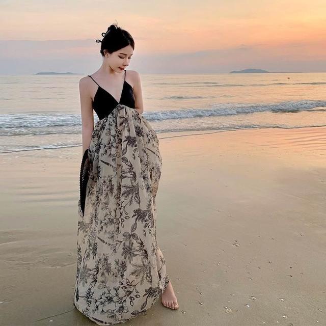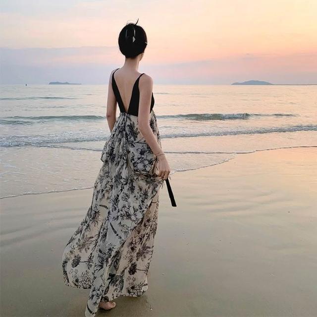 海邊穿搭 度假穿搭 雲南旅遊拍照穿搭女裝夏季超仙海邊度假露背洋裝三亞吊帶沙灘裙