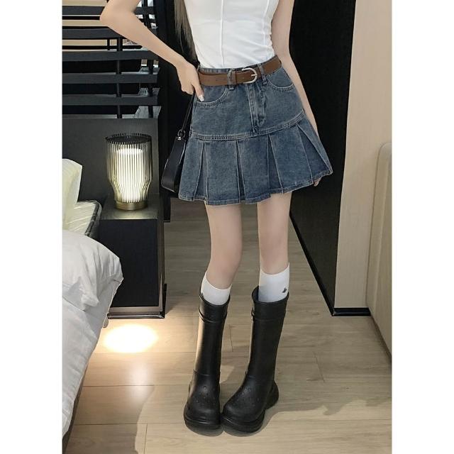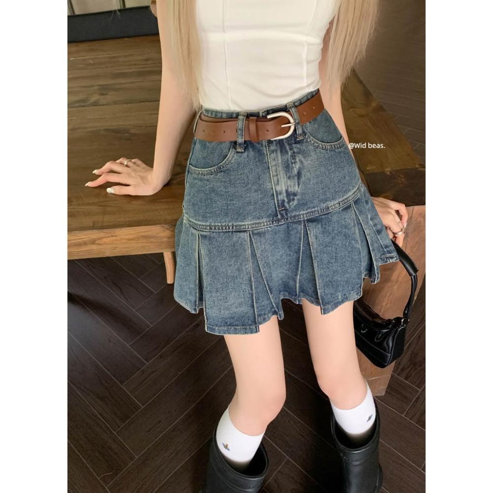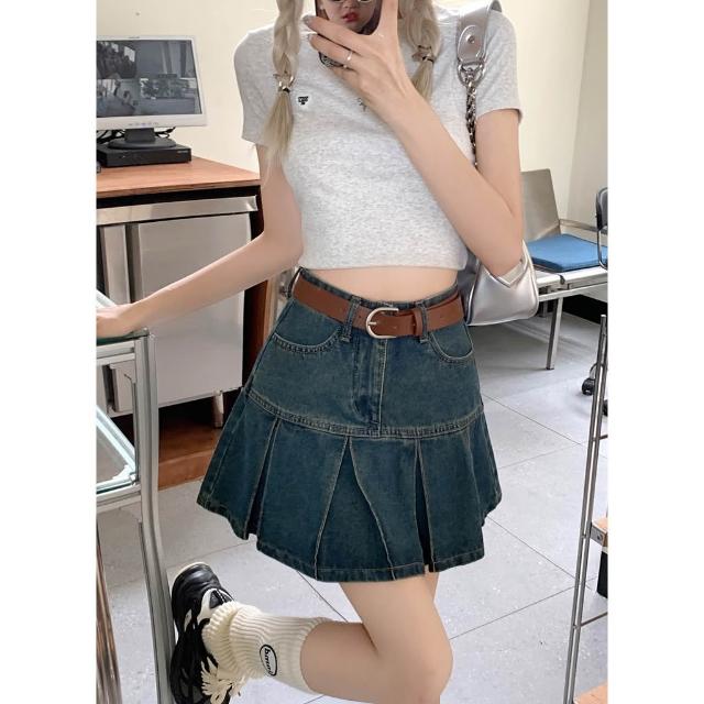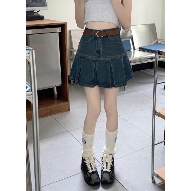 美式復古百褶牛仔短裙女夏季新款顯瘦a字牛仔半身裙韓版百褶裙 牛仔裙