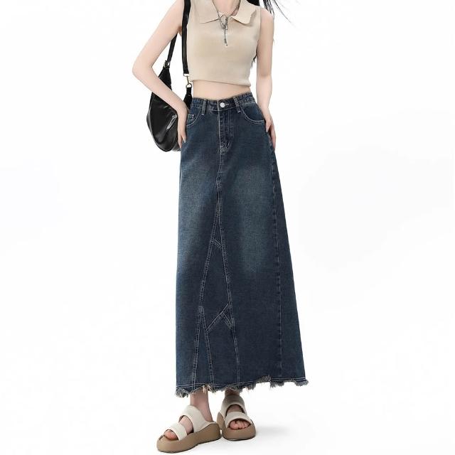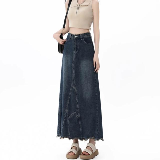 美式高腰顯瘦牛仔 半身裙 2025春夏新款水洗復古魚尾a字毛邊中長裙