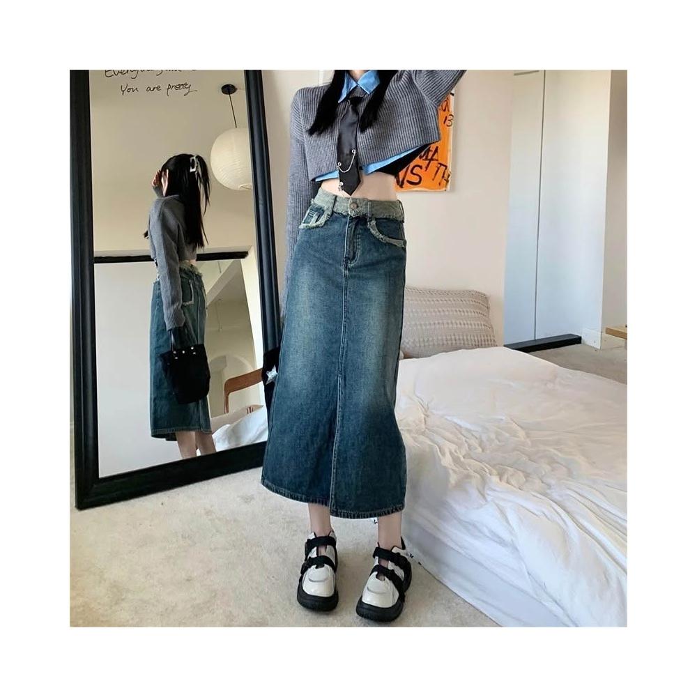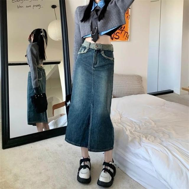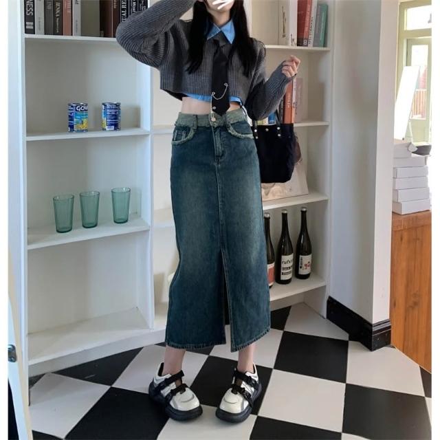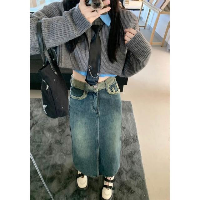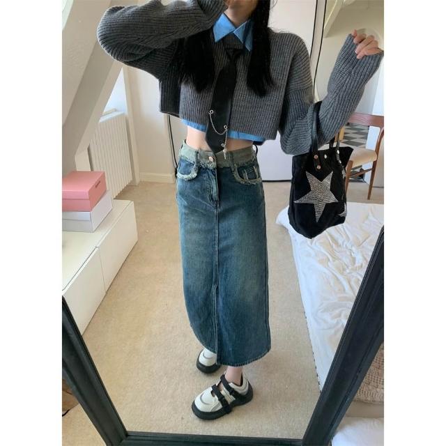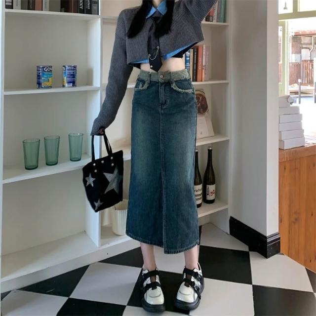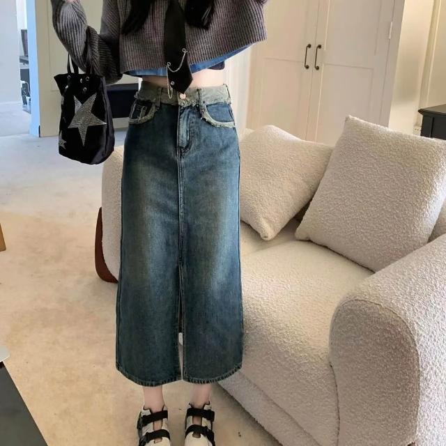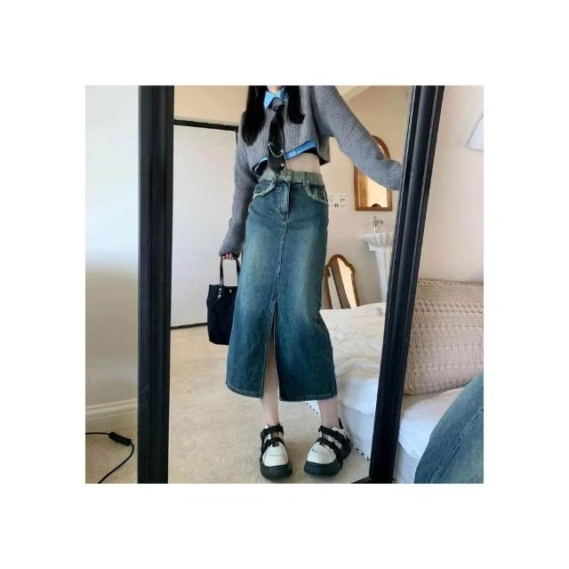 高腰開衩牛仔 半身裙 女設計感毛邊a字簡約時尚復古水洗a字 半身裙