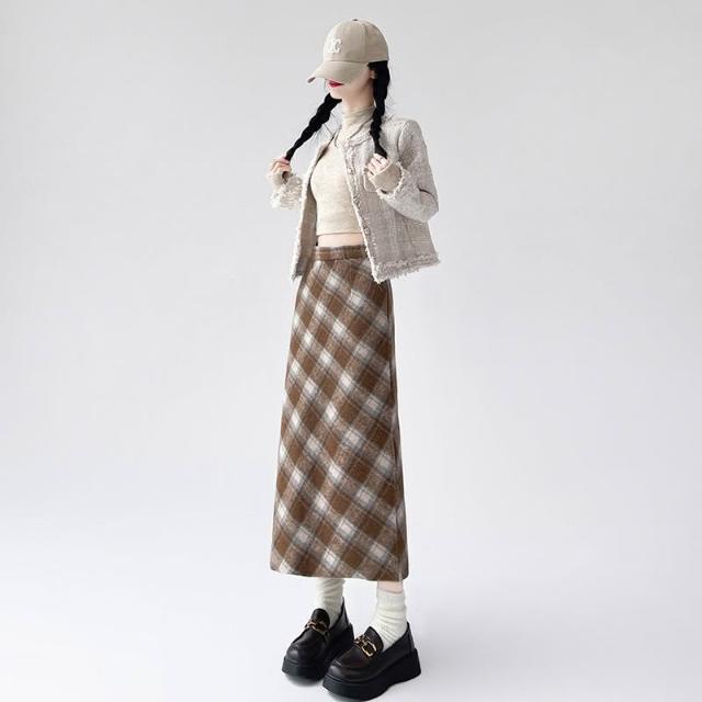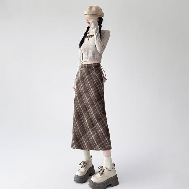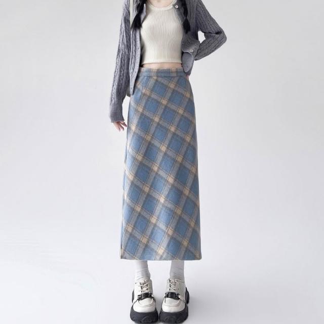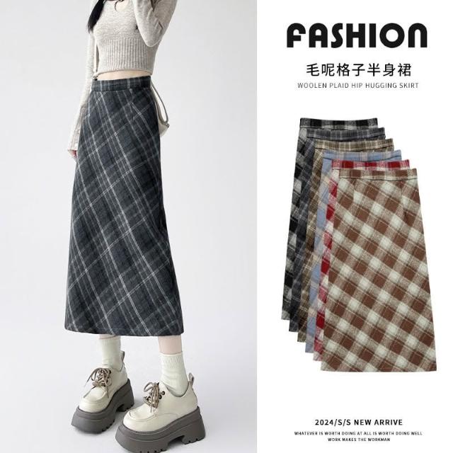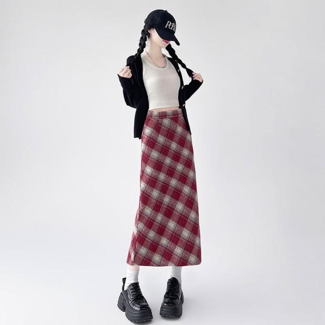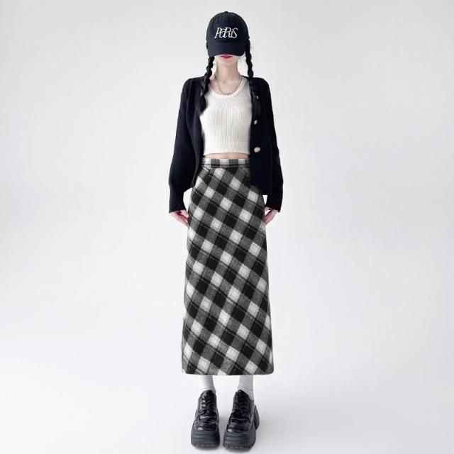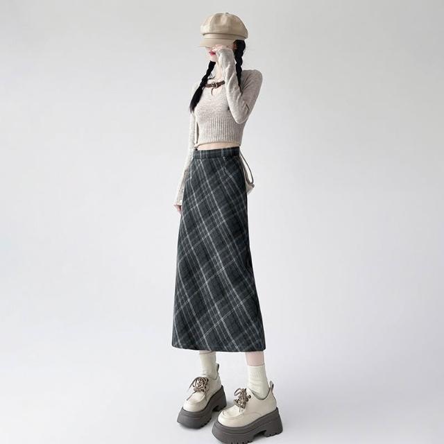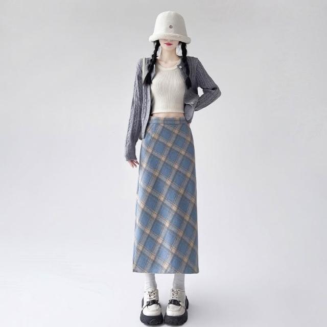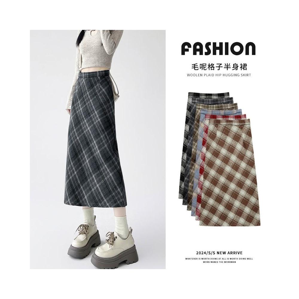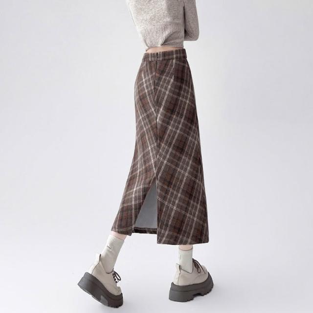 Uni 半身裙格子復古半身裙女秋冬新款高腰顯瘦開叉包臀格紋中長款A字裙 包臀裙女