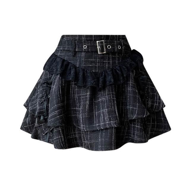 設計感辣妹黑色格紋半身裙蓬蓬裙女鞦季顯瘦百褶裙a字短裙