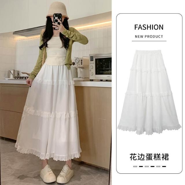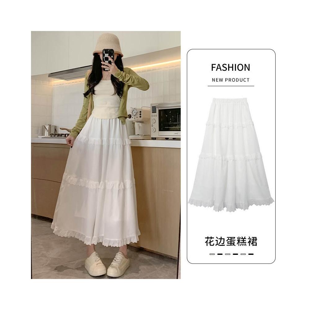 白色蛋糕裙半身裙女 春夏新款裙子 高腰顯瘦蕾絲溫柔風 長裙A字傘裙