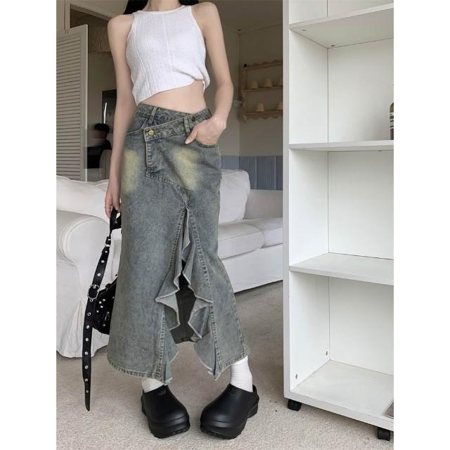 設計感荷葉邊不規則牛仔半身裙女復古高腰顯瘦開叉魚尾裙子 牛仔長裙