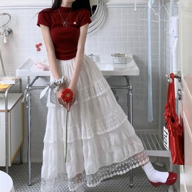 白色 半身裙 女設計感蕾絲花邊蛋糕裙春夏高腰法式長裙大擺a字裙子