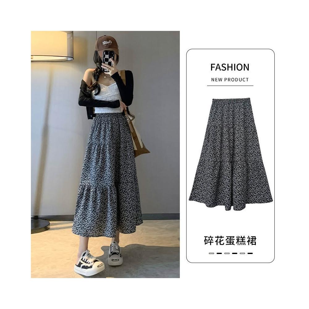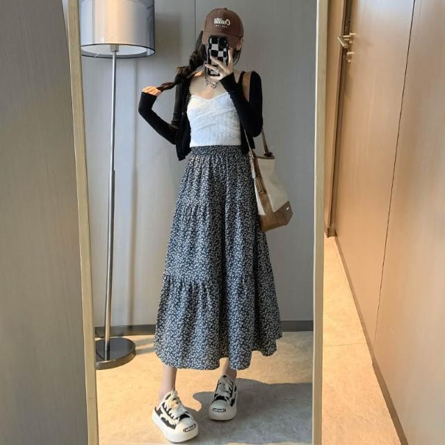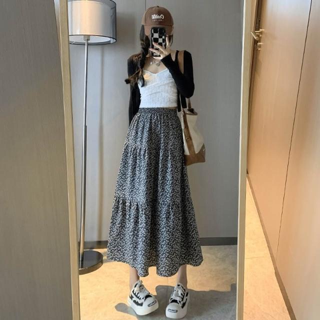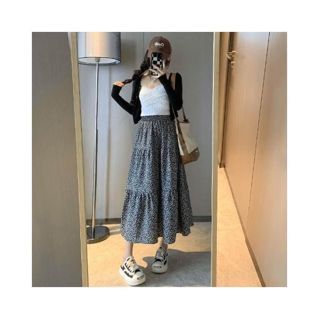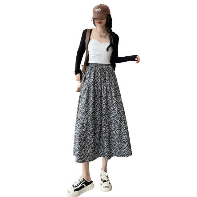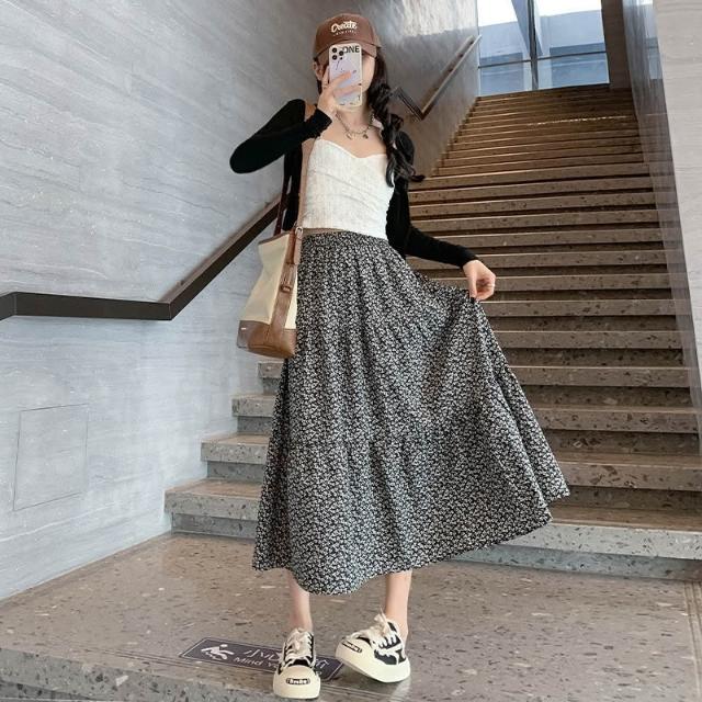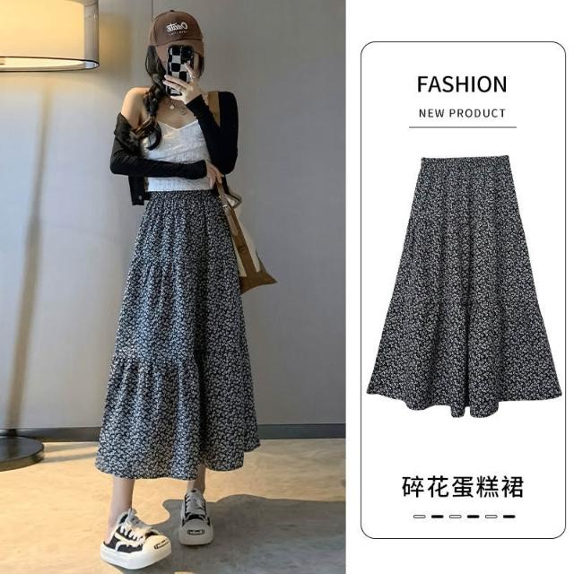 碎花半身裙女 春夏新款高腰顯瘦A字大裙擺溫柔風黑色中長款蛋糕裙