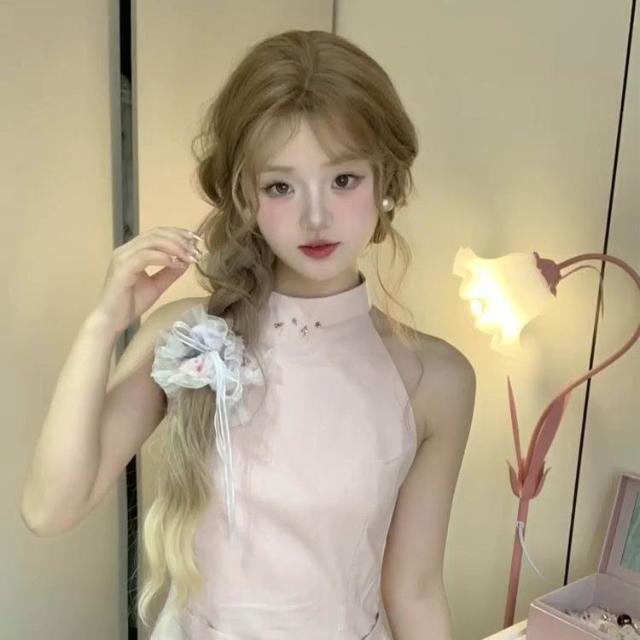 粉色掛脖洋裝 無袖蓬蓬花苞裙 夏季新款休閒女裝
