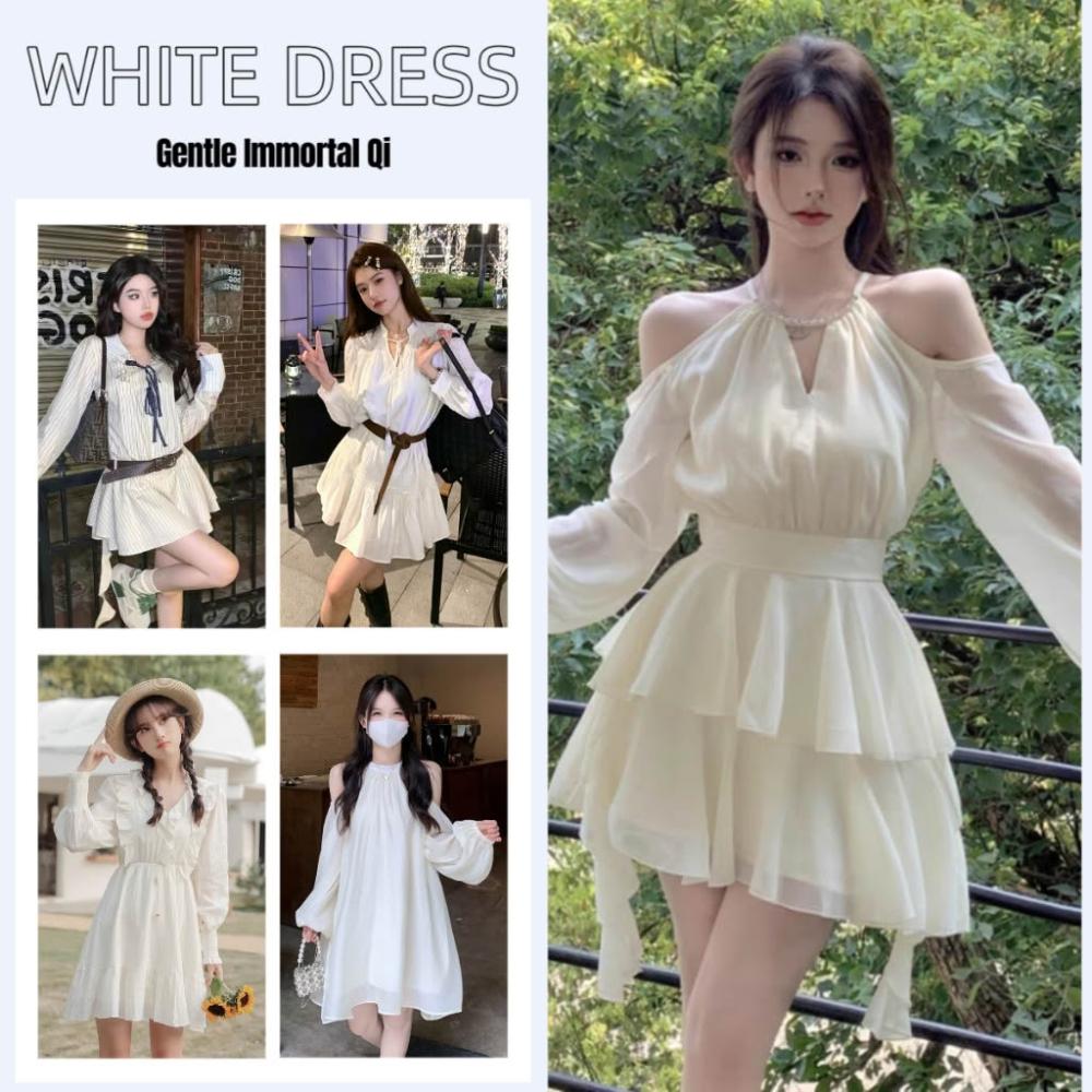 法式溫柔甜美連衣裙 泡泡袖連衣裙 收腰顯瘦 氣質洋裝 A字裙 V領 洋裝 長袖連身裙 茶系洋裝 露肩 雪紡洋裝