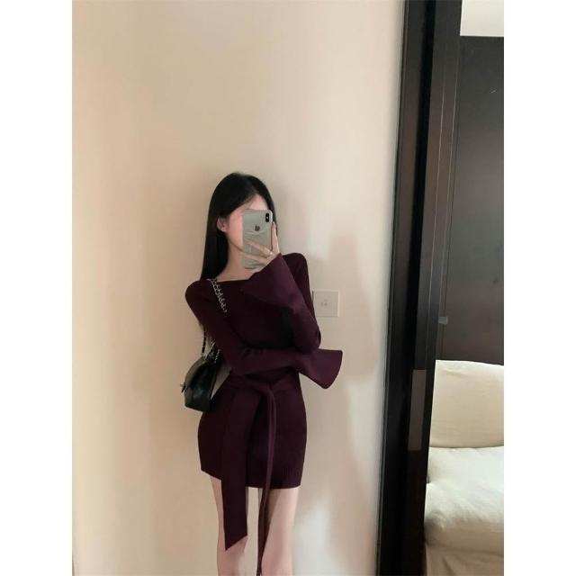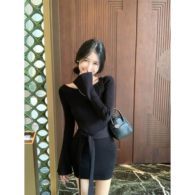 韓國~氣質歐膩喇叭袖針織洋裝 秋季長袖緊身顯瘦長款包臀裙 女生裙子
