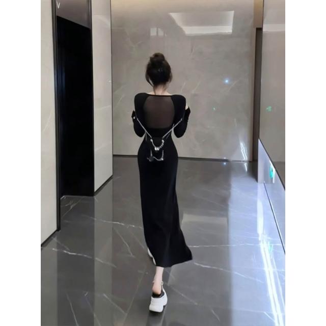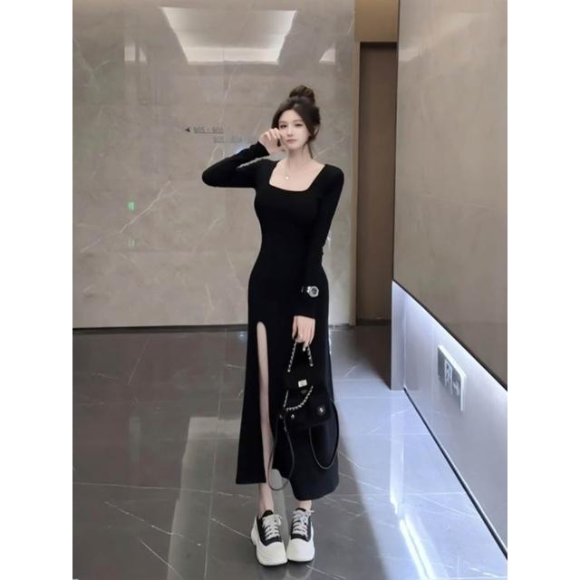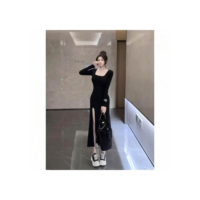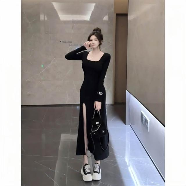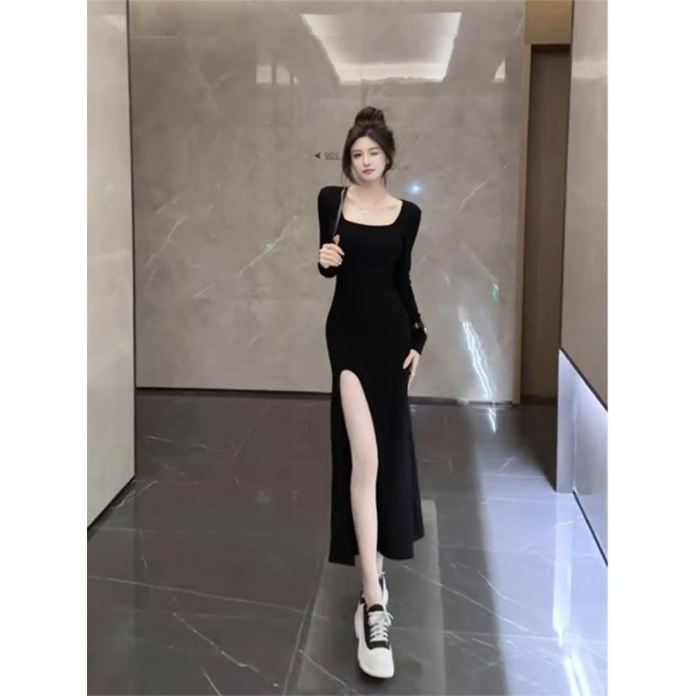性感辣妹開叉修身長袖連衣裙女裝春鞦季緊身顯瘦打底內搭長款裙子