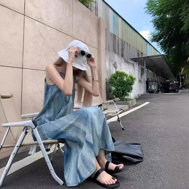 法式絕美扎染吊帶連衣裙女夏季寬鬆慵懶風三亞海邊度假沙灘長裙子