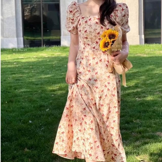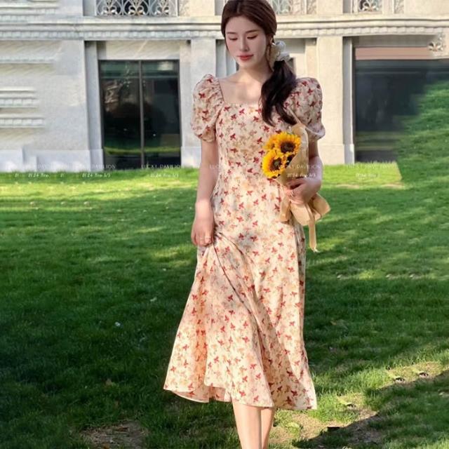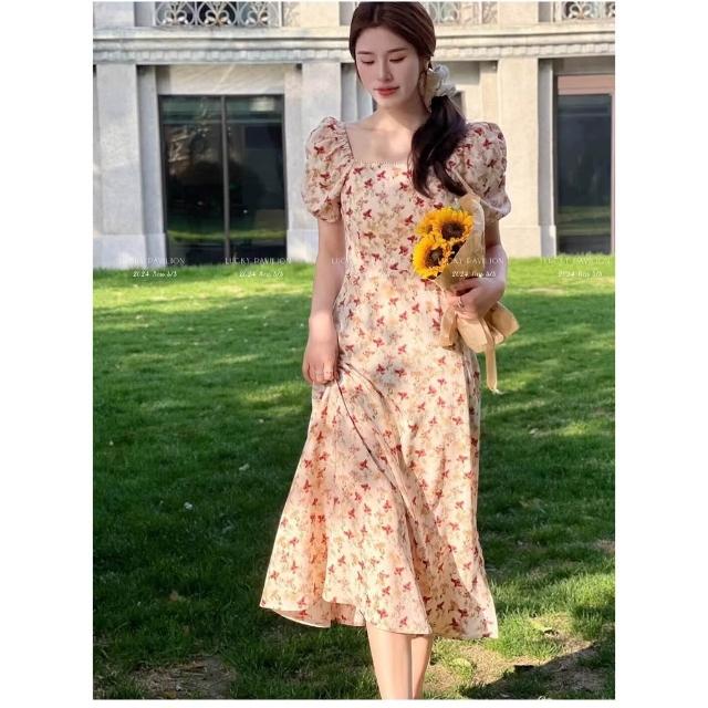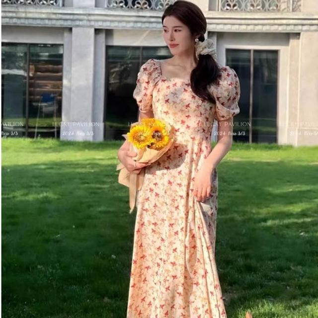 2025新款海邊度假風方領泡泡袖連衣裙夏季女裝胖mm顯瘦碎花茶歇裙