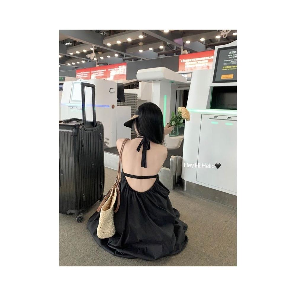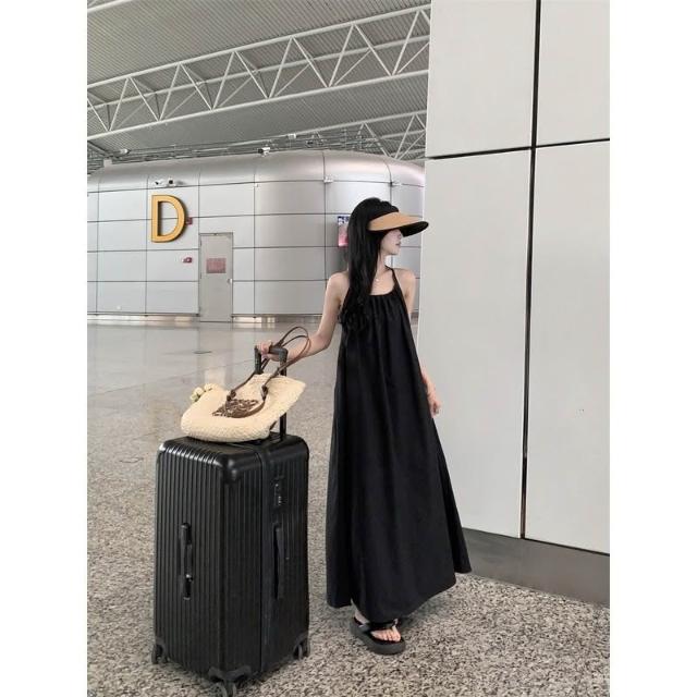 法式~絕美氣質高級感掛脖綁帶性感露背洋裝 遮肚子減齡休閒寬鬆海邊️度假長裙 過膝長洋 女生夏天洋裝