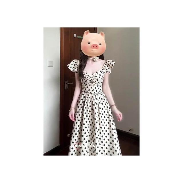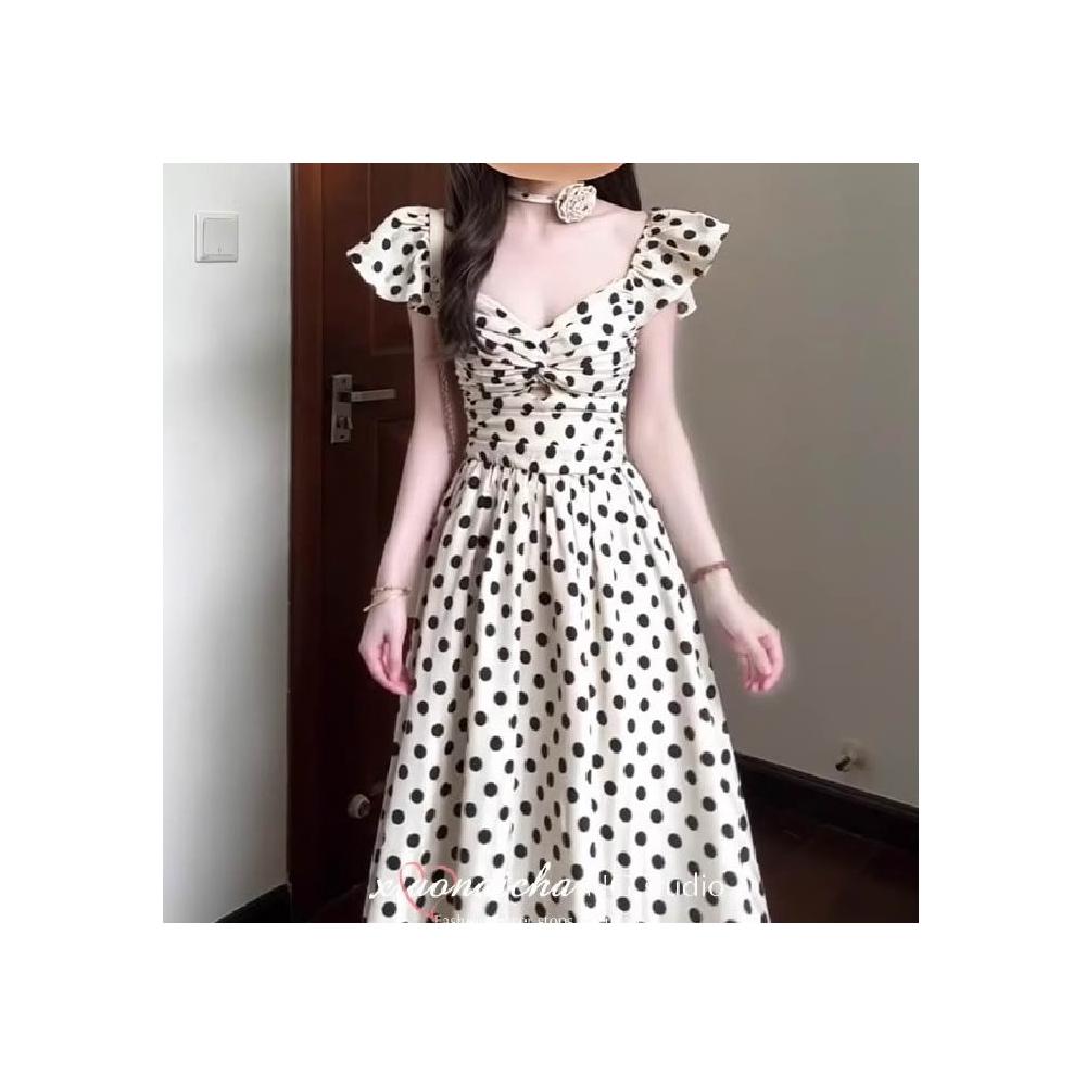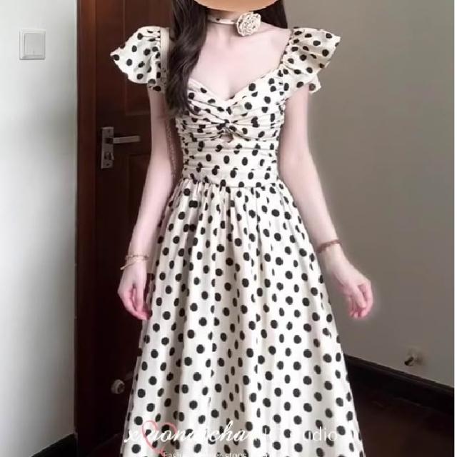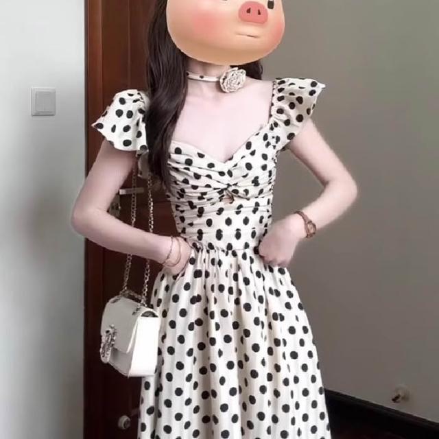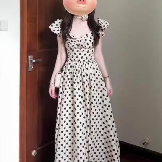 法式度假風小飛袖波點連衣裙女夏季高級感褶皺收腰顯瘦中長裙子