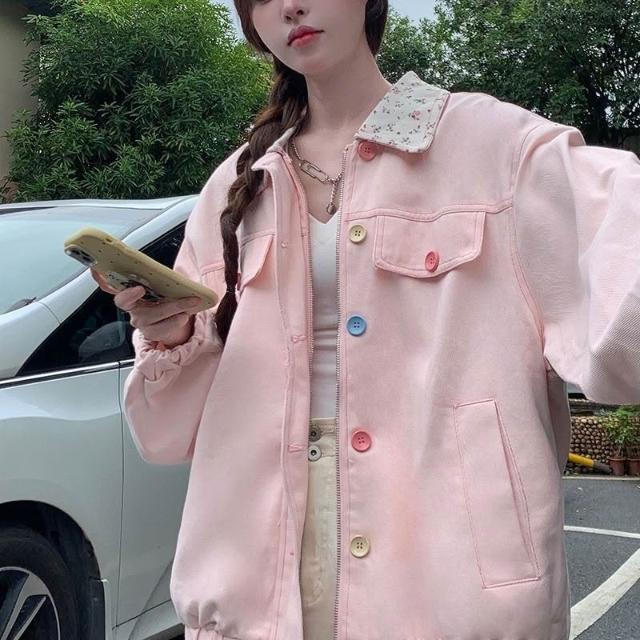美式高街甜美风设计感粉色小碎花外套女2024春秋新款宽松百搭上衣