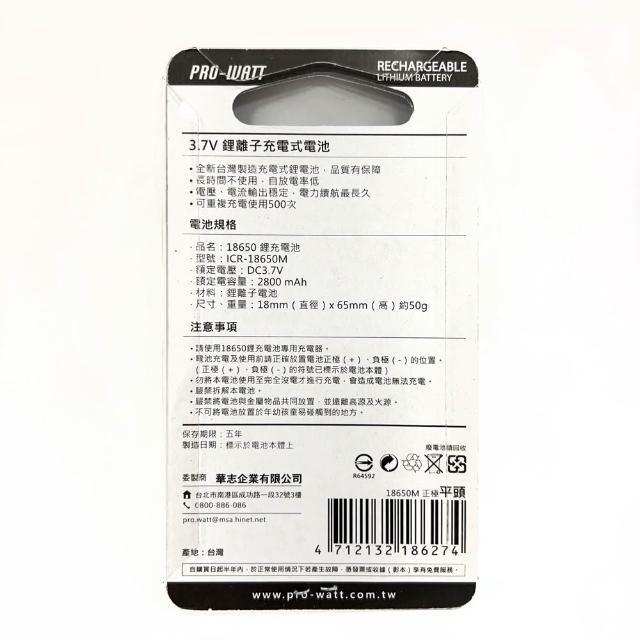 華志2800mAh高容量18650平頭 1入 充電式 鋰電池(台製)