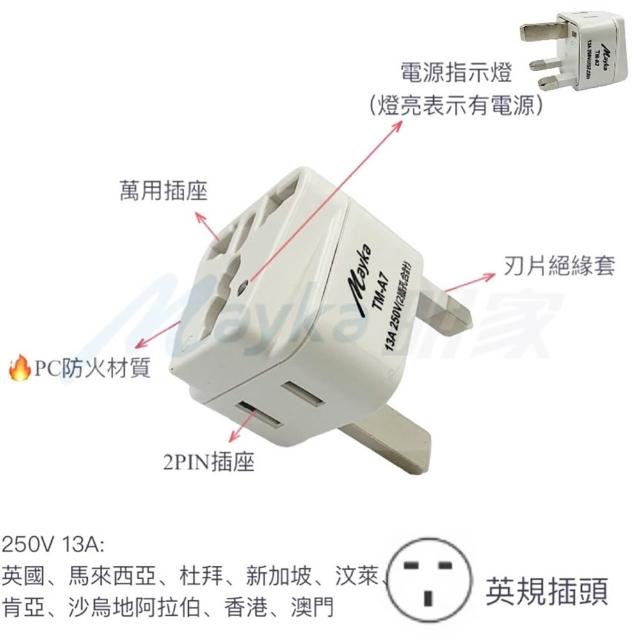 Mayka 明家2組TM-A7 2插 T型+2孔 插座 指示燈 旅行 萬用轉接頭(250V英國、馬來西亞、新加坡、汶萊