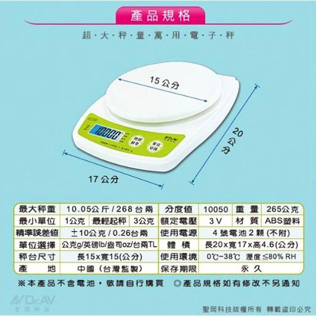 Dr.AV 聖岡科技XT-10K超大秤量 萬用 電子秤1公克~10.05公斤(單位切換4種 盎司/英鎊15公分超大秤盤
