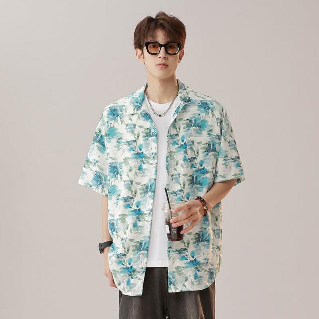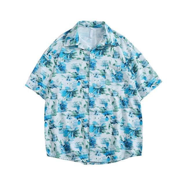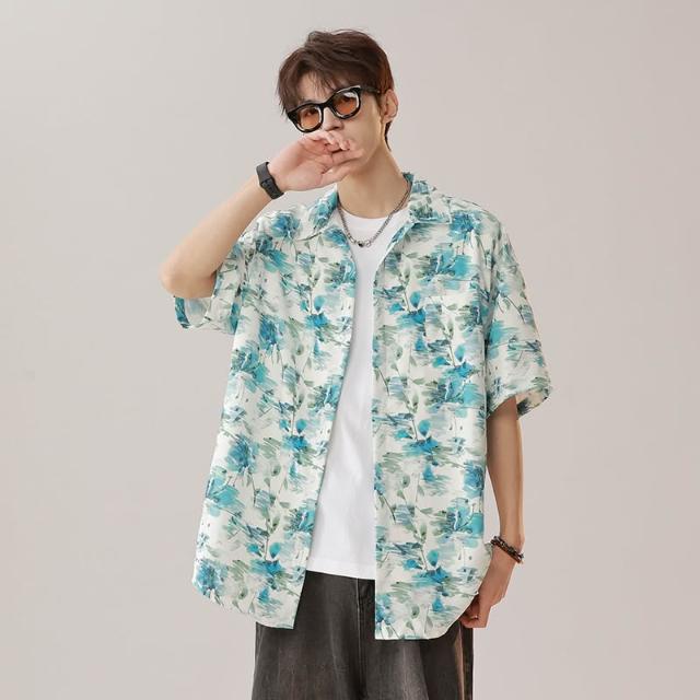 夏季新品男古巴領印花短袖襯衫冰絲透氣薄款度假風泰式復古港風花襯衫寬鬆休閒海灘上衣夏季穿搭推薦