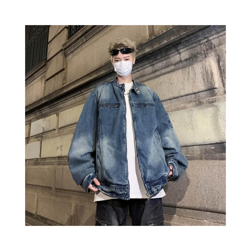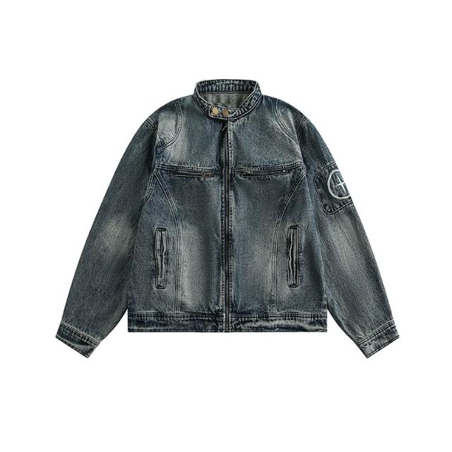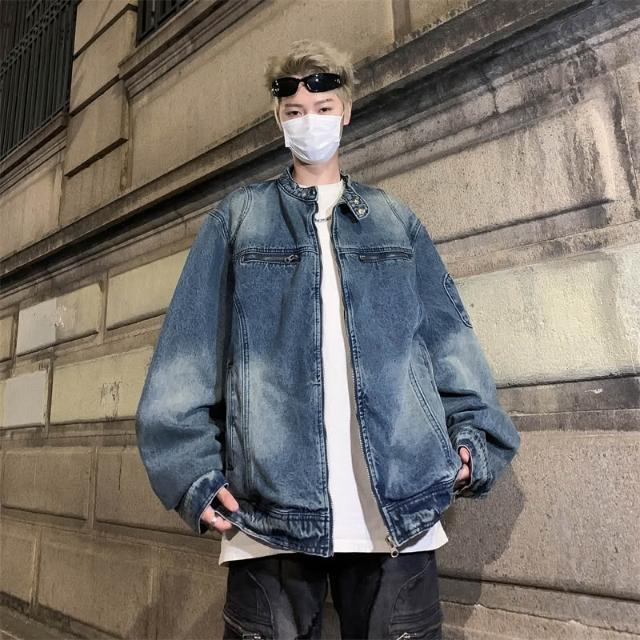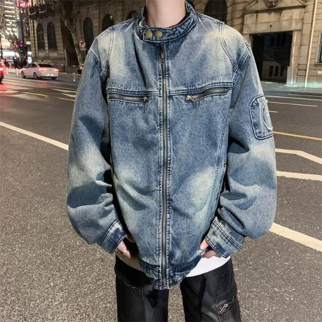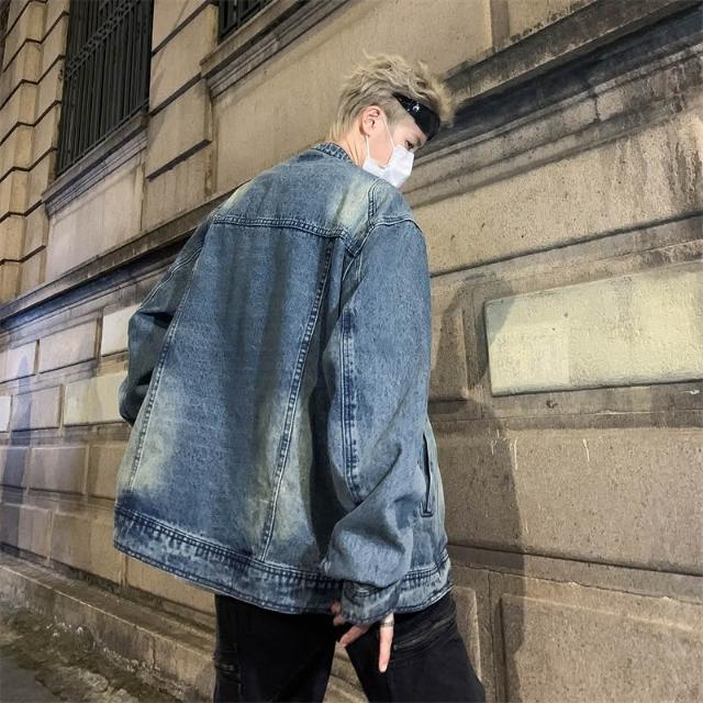 男士外套美式復古寬鬆做舊水洗質感牛仔外套拉鏈夾克百搭潮牌休閑上衣