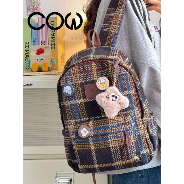 明明嚴選【COW】日系ins秋冬毛呢復古格子書包高中生大學生雙肩包韓版揹包百搭