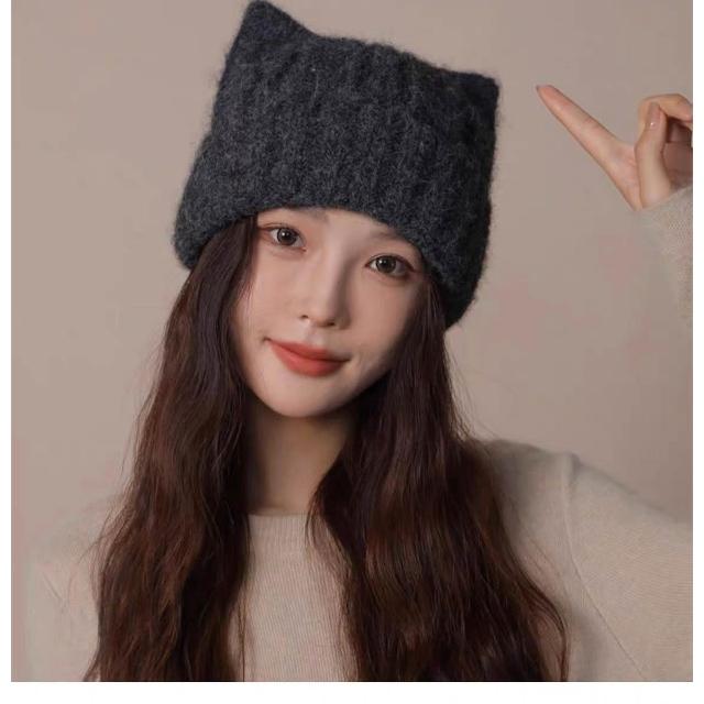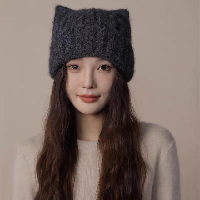 韓國新款可愛貓耳朵軟毛絨針織帽冷帽毛綫帽子女時尚百搭包頭帽潮