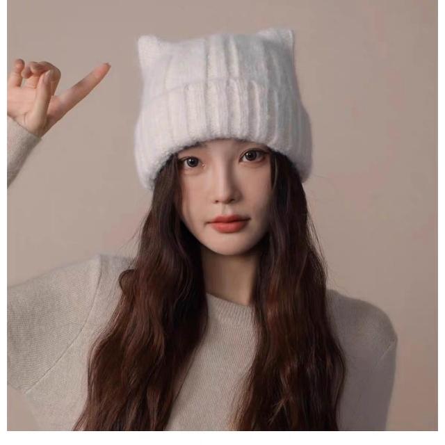 韓國新款可愛貓耳朵軟毛絨針織帽冷帽毛綫帽子女時尚百搭包頭帽潮